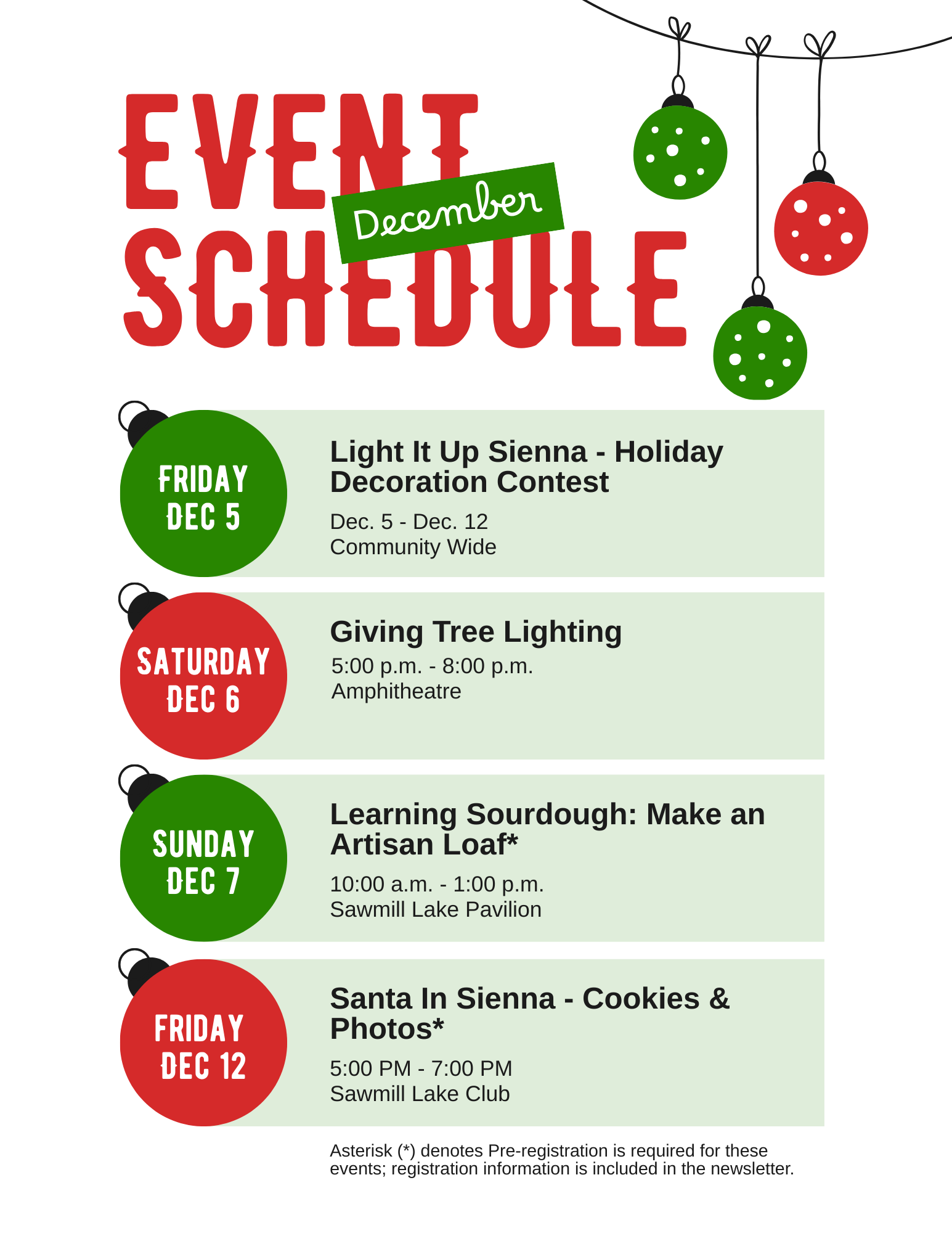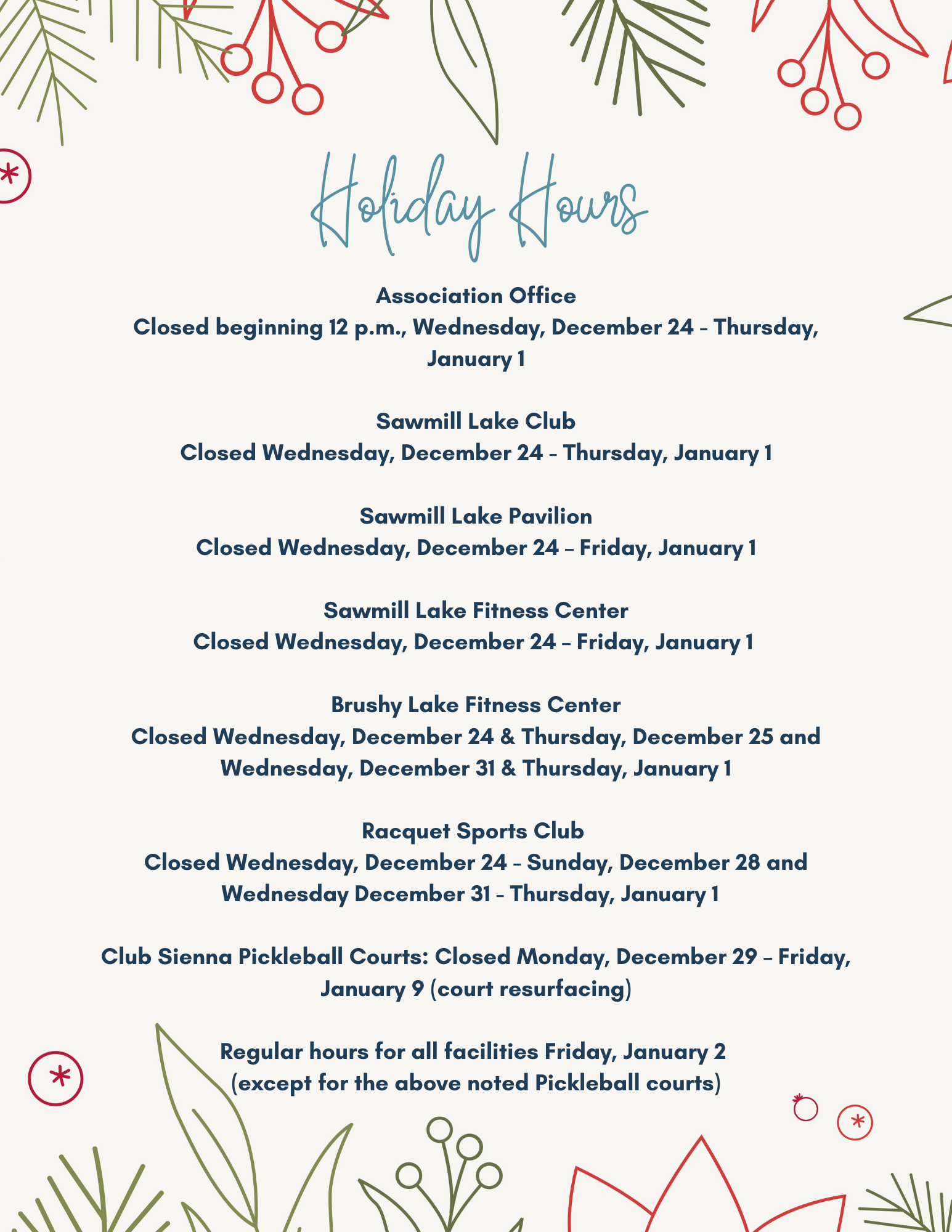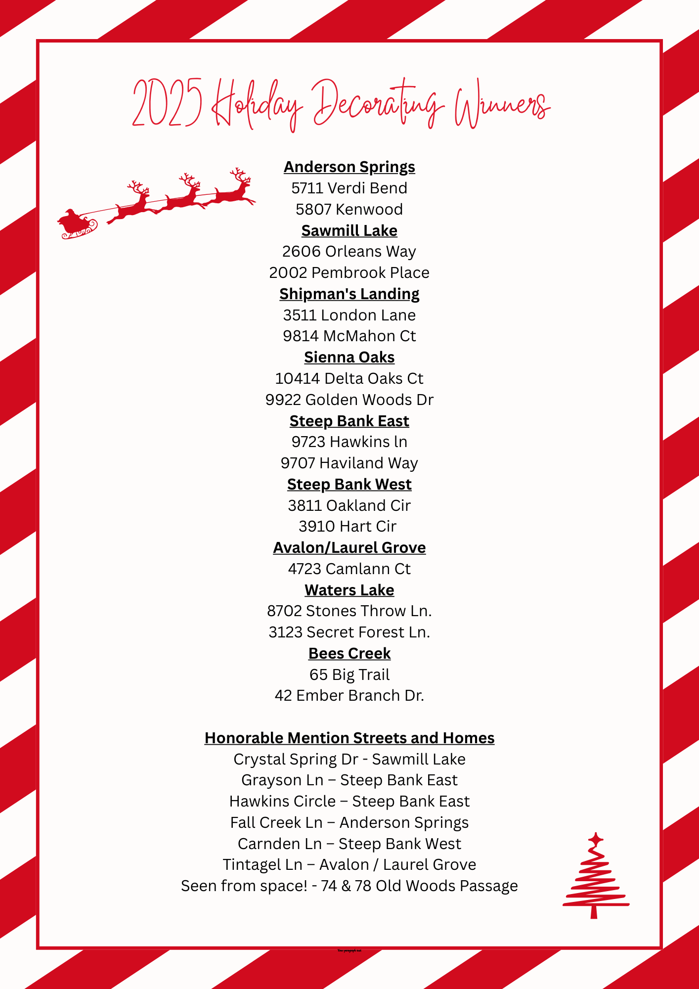 DECEMBER: Orchard, The Plaza, Summer Lakes, Steep Bank West. JANUARY: Fox Bend, Logan Pass, Rosewood, Townhomes, Anderson Springs, Shipman’s Landing and Waters Lake. As a reminder, per Association policy, all exterior holiday decorations must be removed by January 10, 2026.