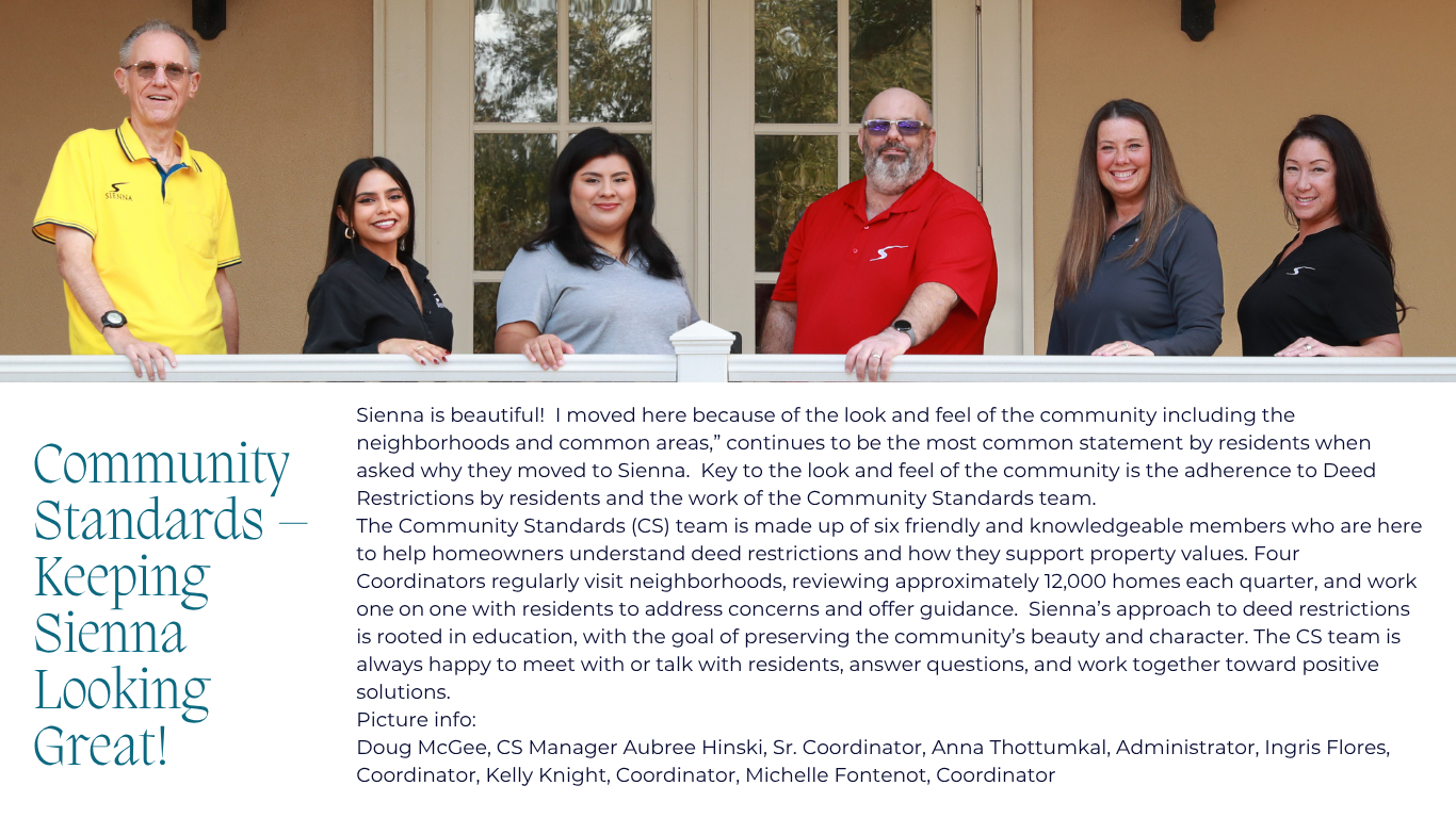 The Community Relations department is responsible for enhancing “life” in Sienna utilizing the 3 C’s; Communication, Customer Service and Community-wide events.