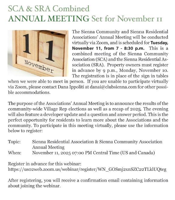 The Sienna Community Association (SCA) and Sienna Residential Association (SRA) will hold their Annual Meeting virtually via Zoom on Tuesday, November 11, from 7–8:30 p.m.  Owners must register in advance by 9 p.m. on Monday, November 10 . The meeting will include election results for Village Reps and the SRA Board of Directors, a 2025 recap, a developer update, and a Q&A session. This is a great opportunity to stay informed and engaged in your community. For assistance or alternate accommodations, contact Dana Ippoliti at danai@clubsienna.com