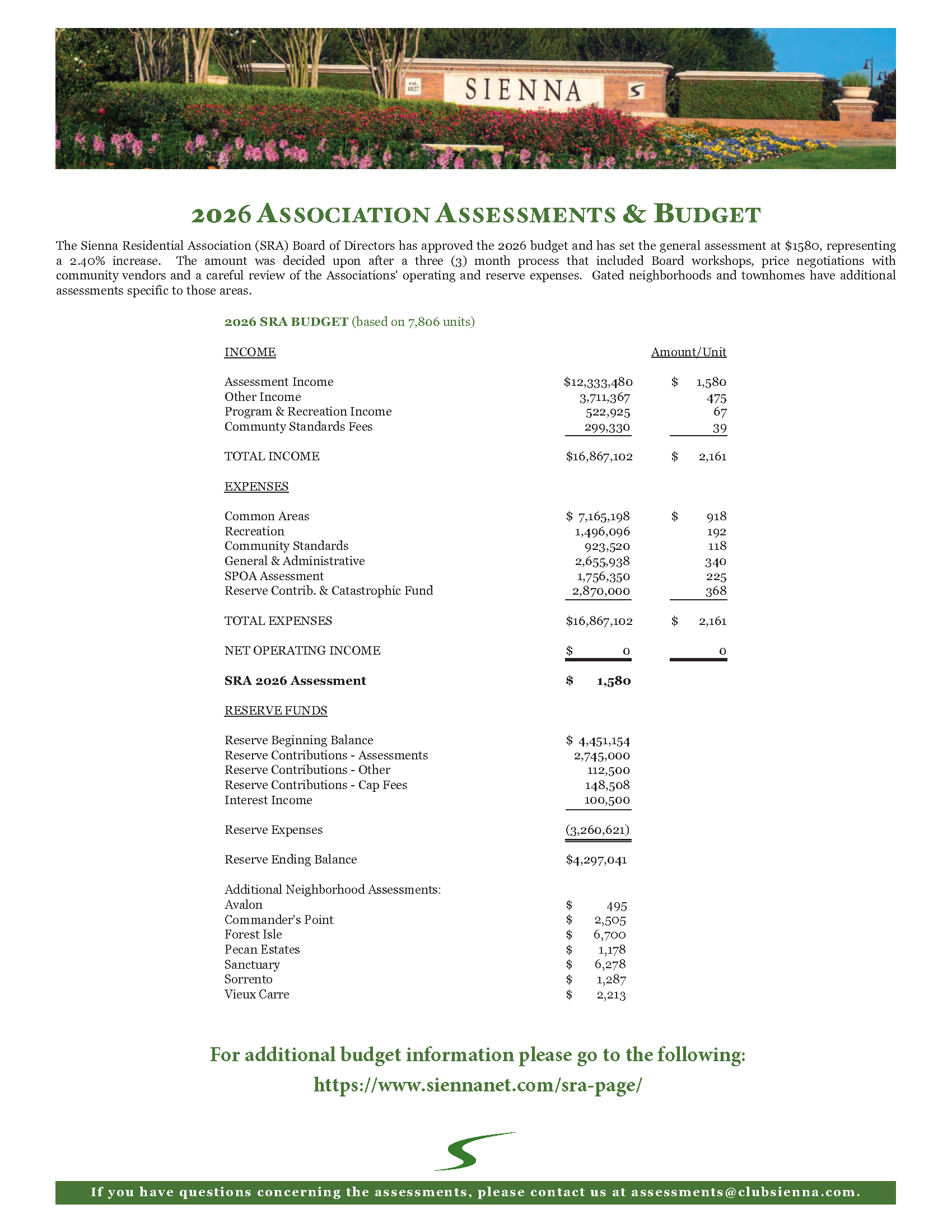 The 2026 Community Association Budget including Income, Expenditures and Reserve Fund.